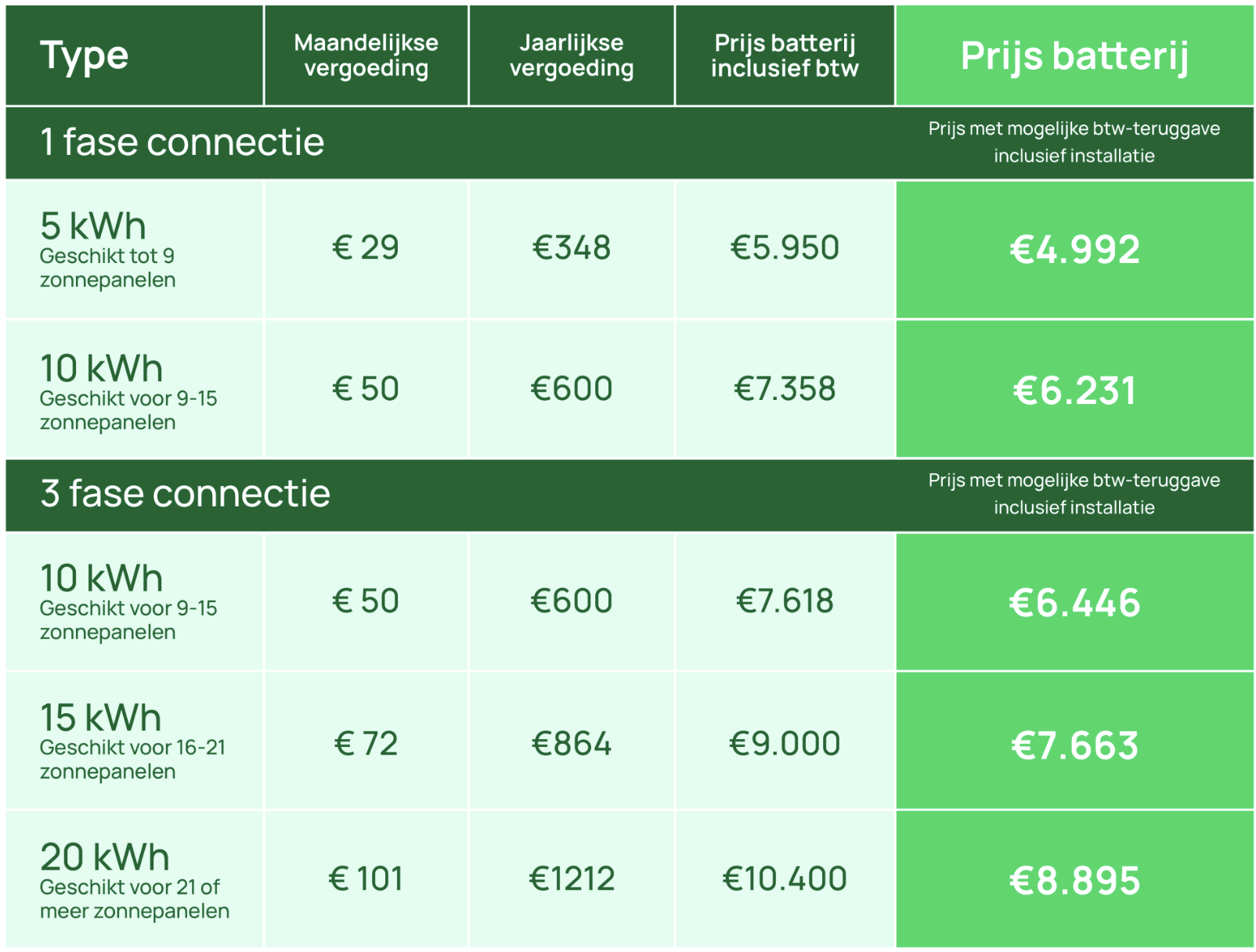 De hoogte van de vergoeding hangt af van het type batterij dat je kiest. Je kunt gegarandeerd 3 jaar lang gebruikmaken van de vaste vergoeding. Zo heb je zekerheid en verdien je alvast een deel van je investering terug. Daarnaast is je thuisbatterij direct klaar voor gebruik zodra de salderingsregeling stopt.